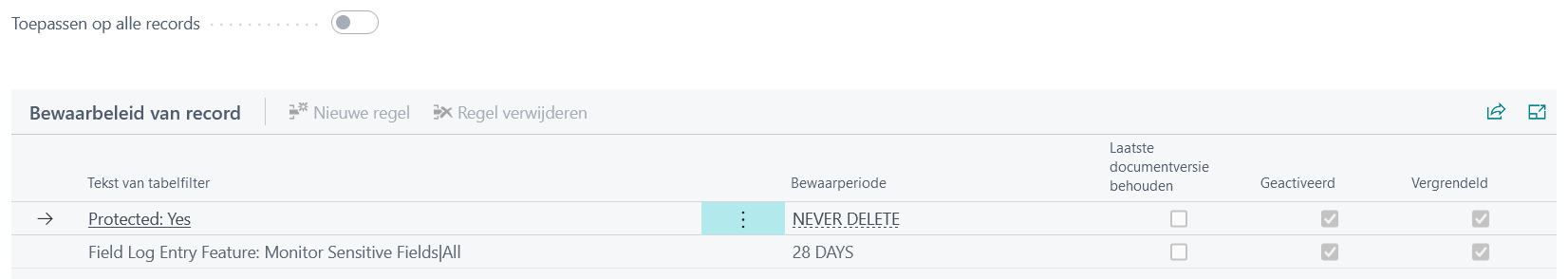 Als u het beleid op specifieke gegevens in een tabel wilt toepassen, schakelt u het veld Toepassen op alle records uit. Vervolgens kunt u in de sneltab Bewaarbeleid van record tabelfilters inrichten om bepaalde records met een afwijkende bewaarperiode te verwijderen, of juist altijd te bewaren.