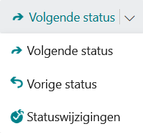 De knoppen Volgende status, Vorige status en Statuswijzigingen zijn gecombineerd in een zgn. 'splitsknop'. Standaard is Volgende status zichtbaar. Is er geen volgende status en zijn er wel vorige statusopties, dan is Vorige status zichtbaar. Zijn er geen volgende en vorige statusopties, dan zijn de knoppen niet actief.