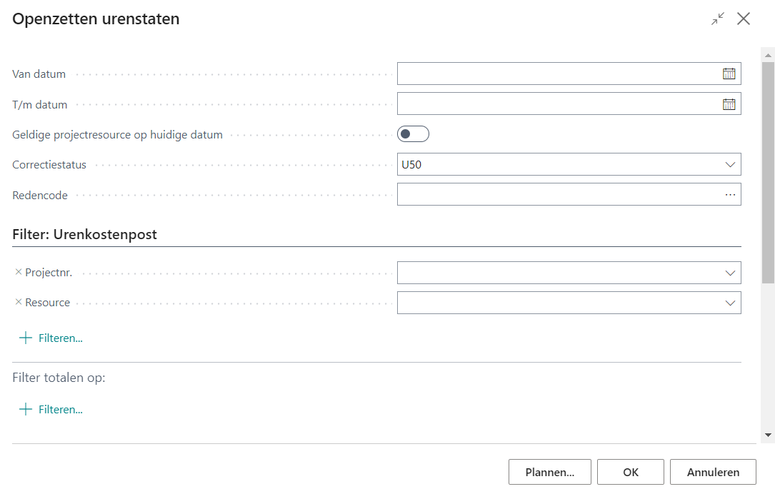 Stel desgewenst een of meer filters in op velden van de urenkostenposten en/of de projectresource.