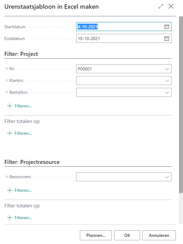 Via de velden Startdatum en Einddatum bepaalt u voor welke periode een Excel-bestand moet worden aangemaakt en welke projectresources daarmee aan het Excel-bestand worden gekoppeld. Standaard zijn de start- en einddatum van de voorgaande week ingevuld.