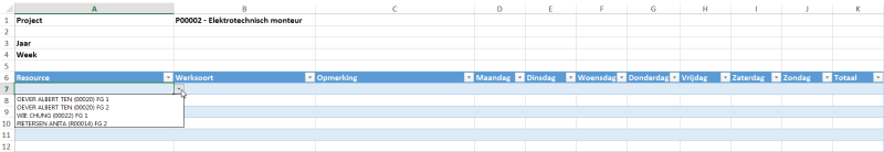 In het veld Resource kan alleen een resource worden geselecteerd die op het project werkzaam is. Het is mogelijk om meerdere urenregels per resource in te voeren, de naam van de resource hoeft dan alleen op de eerste regel (voor deze resource) ingevuld te worden.