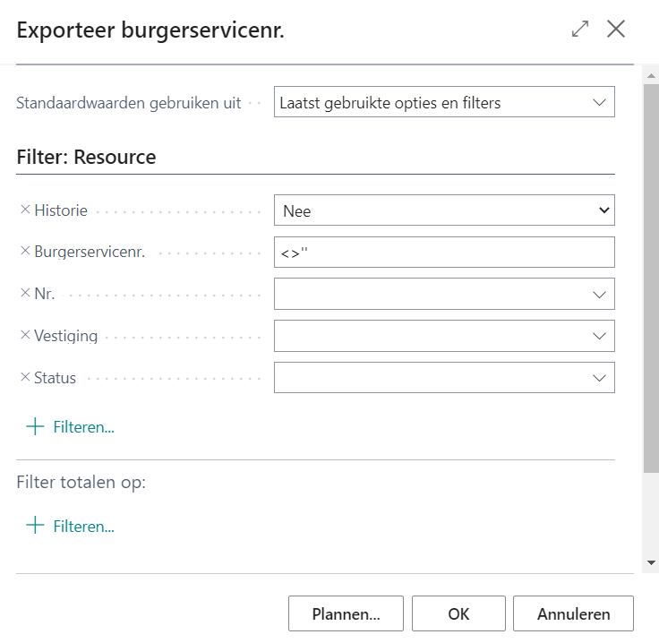 Vanwege de privacygevoeligheid wordt het burgerservicenummer (BSN) niet op het resourceoverzicht getoond (omdat het anders mogelijk is om te zoeken op BSN en zo de bijbehorende resource op te zoeken). Medewerkers die vanuit hun rol wel toegang hebben tot burgerservicenummers en een overzicht moeten maken voor verdere verwerking van het BSN, bijvoorbeeld richting het UWV, kunnen dit rapport gebruiken. Door filters in te stellen bepaalt u welke resources (en dus welke burgerservicenummers) in het Excel-overzicht worden opgenomen.