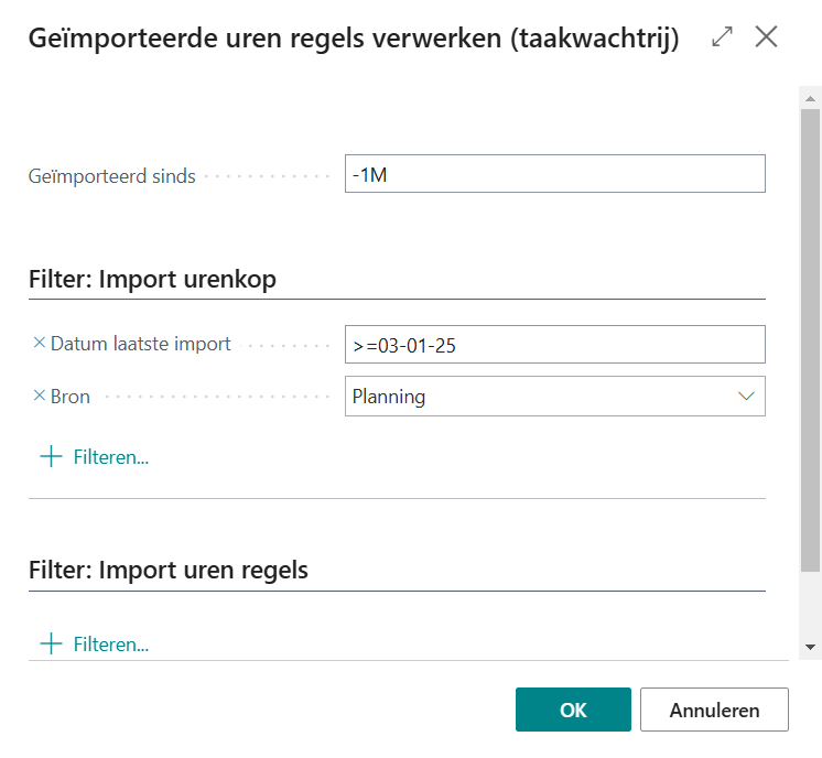 Standaard is in dit veld de datumformule -1M ingesteld, zodat alleen urenimportregels worden verwerkt die afgelopen maand zijn geïmporteerd. Wilt u een andere periode, dan past u de datumformule aan.