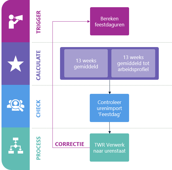 Voorbeeld: De feestdag valt op maandag. Een resource die op 8 maandagen van de 13 weken steeds 7 uur heeft gewerkt, krijgt (8 * 7 =) 56 / 8 = 7 uur doorbetaald.