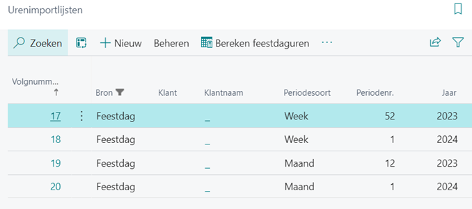 Het is mogelijk om op de pagina Urenimportlijsten een filter in te stellen op Bron is Feestdag en dat filter op te slaan, zodat u een overzicht hebt van urenimports die via dit rapport zijn aangemaakt.
