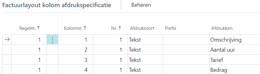 Als u de waarde van een bepaald veld wilt afdrukken. In de kop bijvoorbeeld het factuurnummer of de factuurdatum, in de body bijvoorbeeld het aantal, tarief en regelbedrag. Het veld kiest u in het veld Afdrukken. |