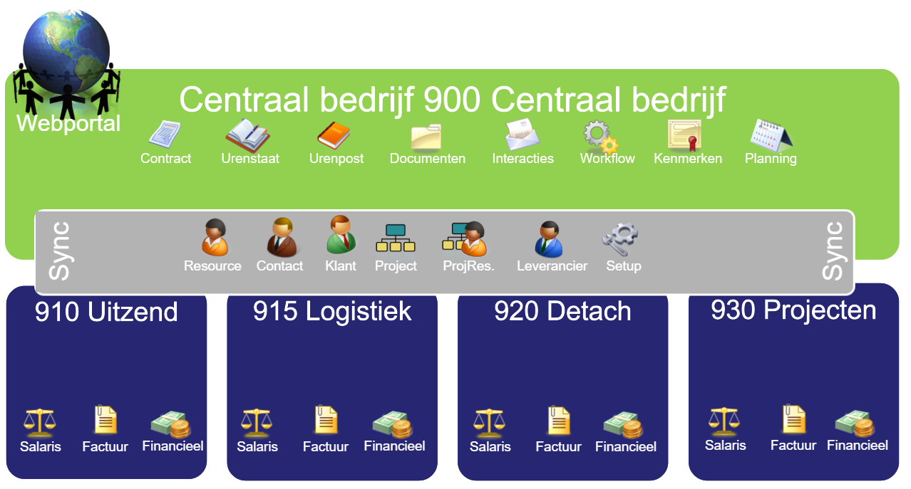 De afbeelding geeft het concept van het centraal bedrijf weer. De meeste bewerkingen vinden plaats in het centrale bedrijf. Stamgegevens worden gesynchroniseerd naar de verschillende bedrijven. In de decentrale bedrijven vindt de financiële administratie plaats.
