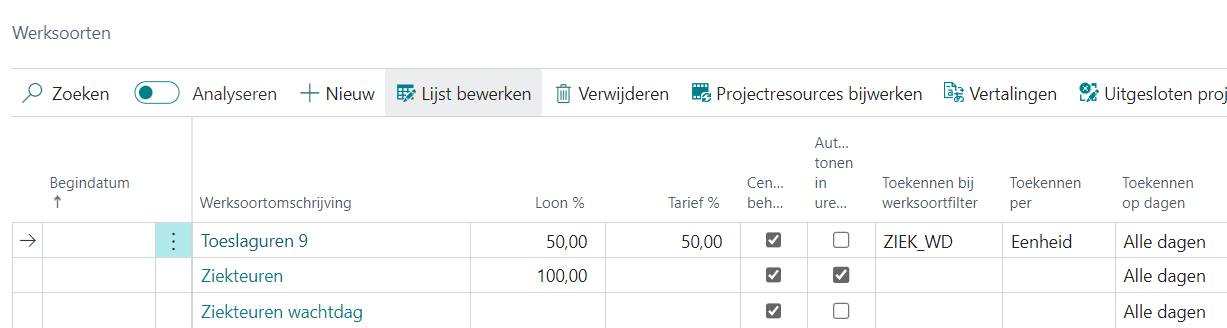 Op het project waarop ziekte-uren worden geschreven, moeten de werksoorten voor ziekte/verzuim actief zijn, dus toegevoegd aan de sneltab Berekende werksoorten van de pagina Projectloon en -tarief.