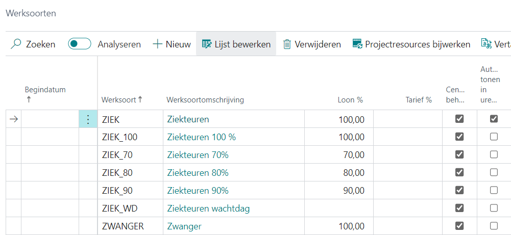 Als ziekte-uren niet op een algemeen project worden geschreven (zie ook hierna), moeten die werksoorten voor ziekte/verzuim ook actief zijn op de projectresource.