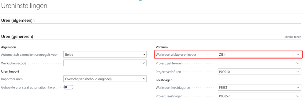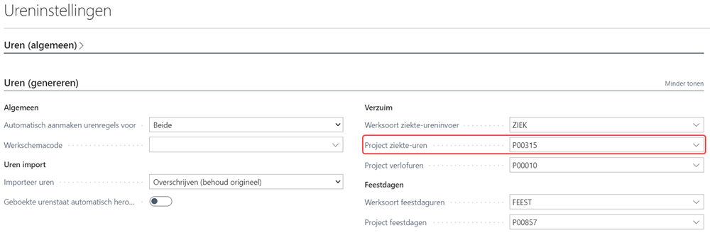 Worden ziekte- en verzuimuren in uw organisatie op 1 algemeen, intern project geschreven, dan stelt u dat project in op de pagina Ureninstellingen in het veld Project ziekte-uren.