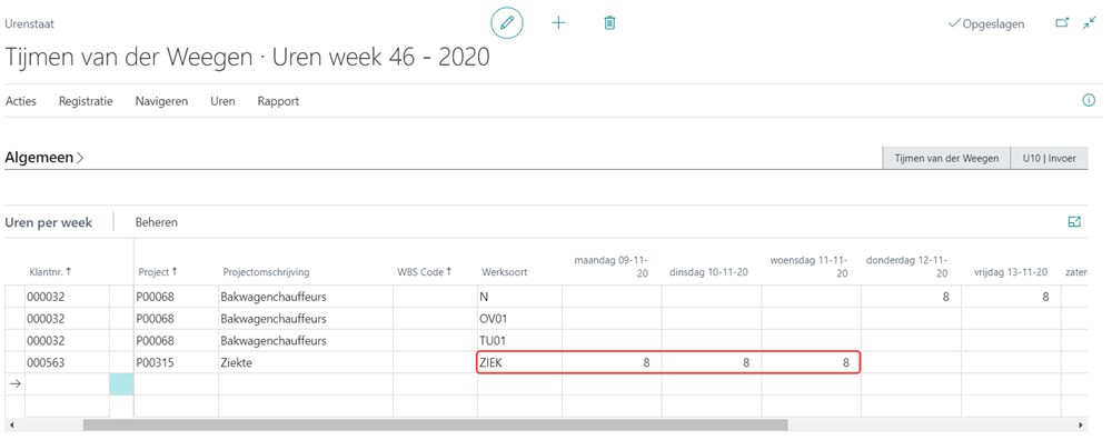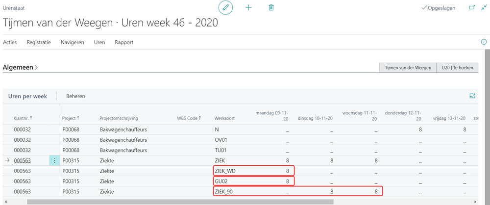 Wanneer de urenstaat de status Te boeken krijgt (waarin de optie Bereken ziektevergoeding is aangevinkt), komen daar automatisch nog regels met werksoort ZIEK_WD (8 uur), ZIEK_90 (16 uur) en GU04 (8) bij.