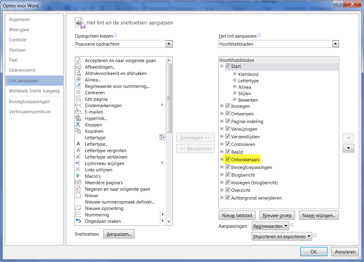 Het tabblad Ontwikkelaars weergeven in Microsoft Word