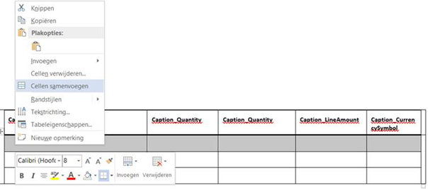 Stel dat u op het eerste niveau het project hebt gedefinieerd en daarbij een flexibele tekst hebt ingesteld. Zie ook Flexibele teksten Word factuurlay-out. Als u op de eerste regel onder de captions alleen die flexibele tekst zou willen afdrukken, hebt u in die regel maar 1 kolom nodig. Voeg in dat geval de kolommen van de eerste regel onder de captions samen. Selecteer daarvoor de regel, klik op uw rechtermuisknop en kies de optie Cellen samenvoegen.