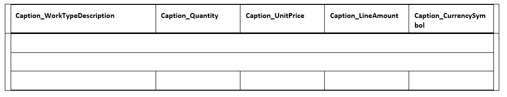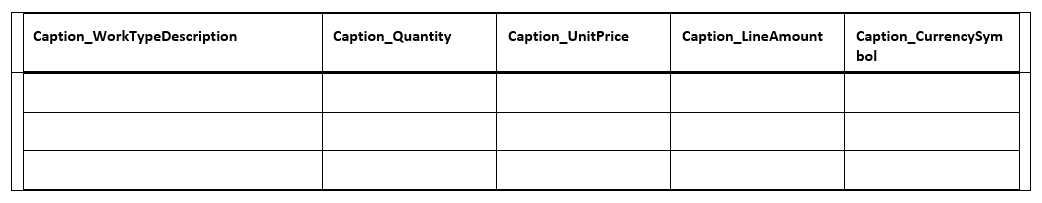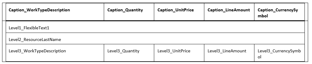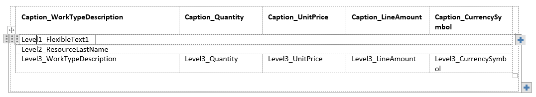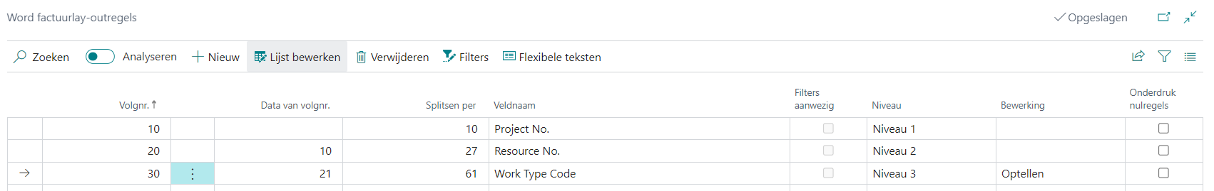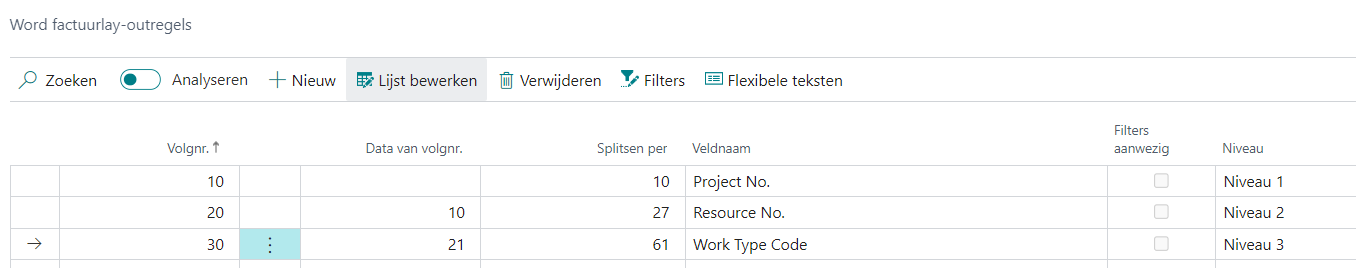 - In de regels onder de captions gaat u velden toevoegen op basis van de sortering en niveaus die u op de pagina Word factuurlay-outs hebt ingericht. Zie ook De opbouw van factuurregels specificeren.