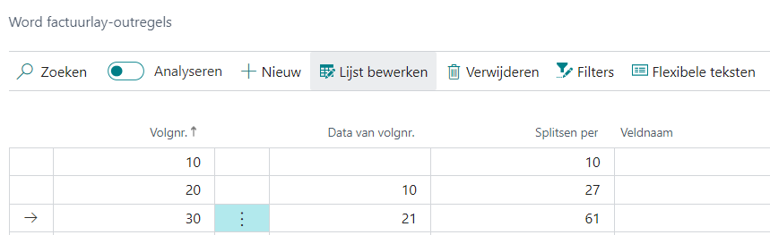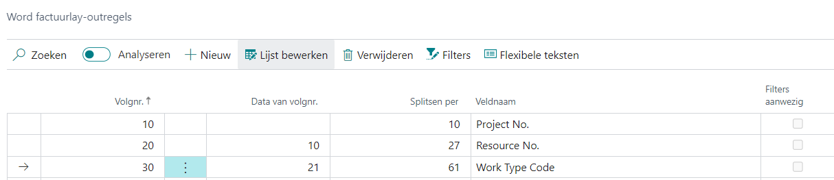 Klik in de actiebalk op Regels. Op de pagina Word factuurlay-outregels stelt u de groepering/splitsing in. Zie ook Pagina Word factuurlay-outregels.