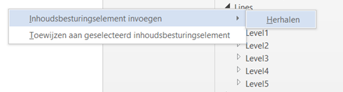 - Selecteer de regel van het eerste niveau, klik met uw rechtermuisknop op de node Level1 en kies de optie Inhoudsbesturingselement invoegen en vervolgens de optie Herhalen.
