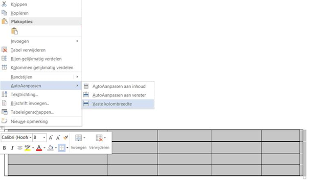 - Zet de kolombreedte vast, anders blijft deze later steeds verschuiven. Selecteer daarvoor de hele tabel, klik op uw rechtermuisknop en kies voor AutoAanpassen en vervolgens voor Vaste kolombreedte.