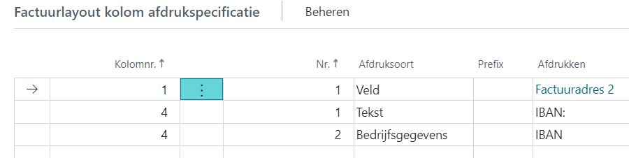 De eerste kolom toont de 2e regel van het factuuradres. De 2e en 3e kolom zijn niet ingevuld, dus die zijn leeg. De vierde kolom bevat de tekst 'IBAN:' met daarachter uw IBAN. Op de afdruk zou dat er als volgt uit kunnen zien: