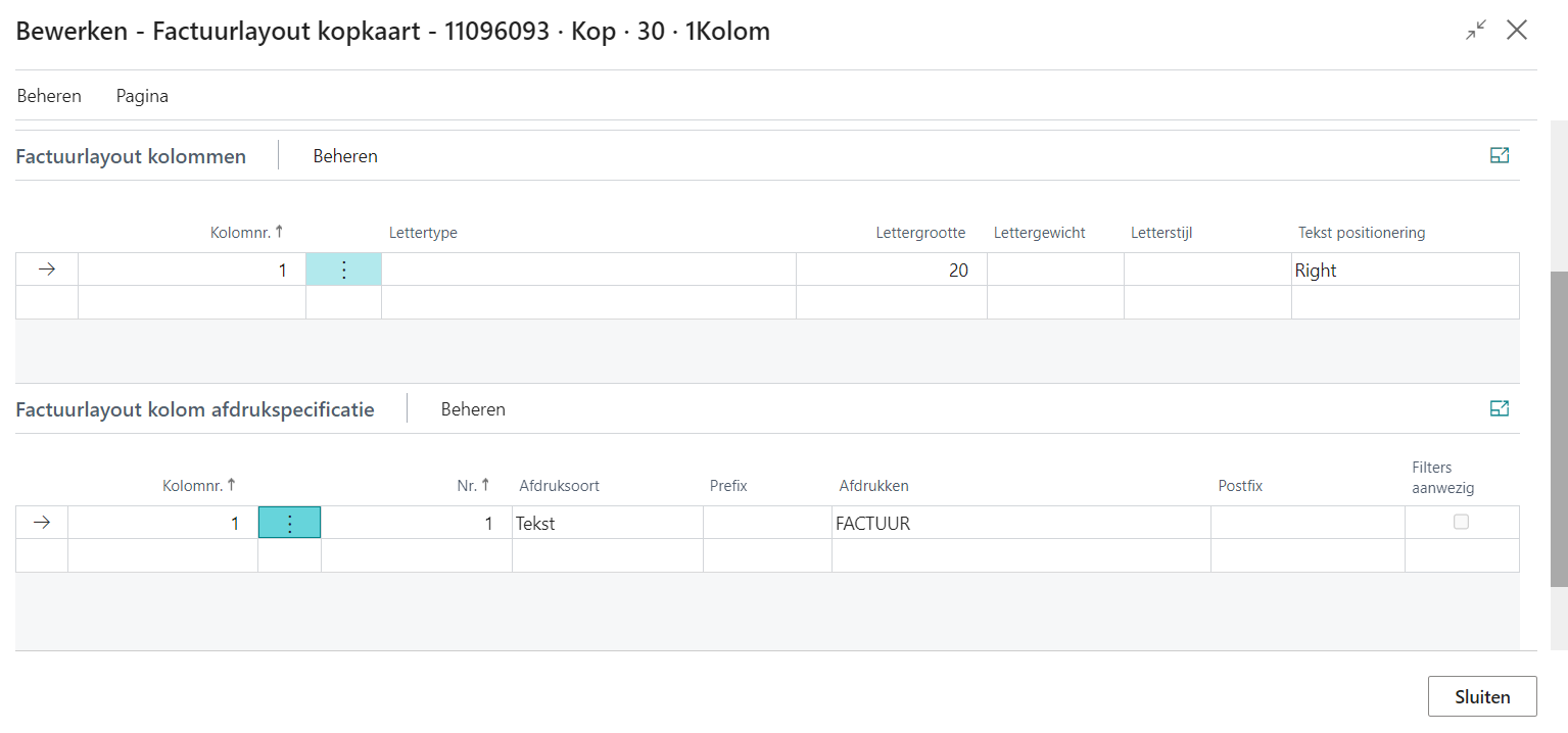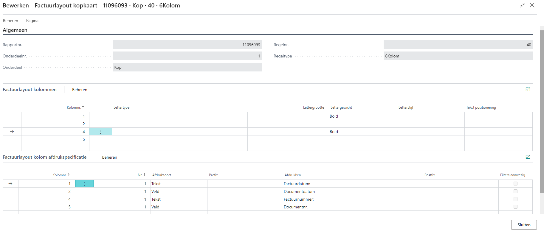 Let op: Vul het kolomnummer altijd in als u een factuurelement wilt opnemen, ook als u geen specifieke opmaak wilt definiëren. Laat u dit achterwege, dan kunt u in de sneltab Factuurlayout kolom afdrukspecificatie niet instellen wat er afgedrukt moet worden.