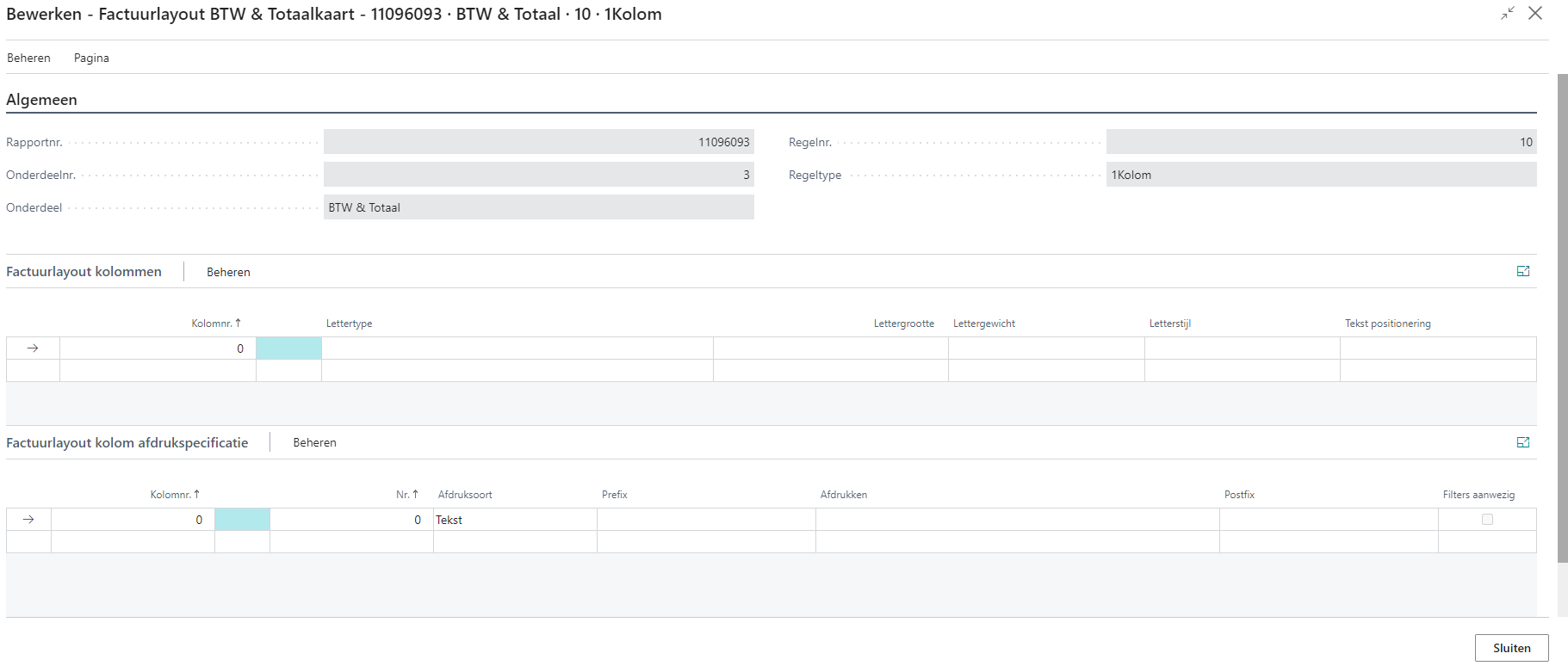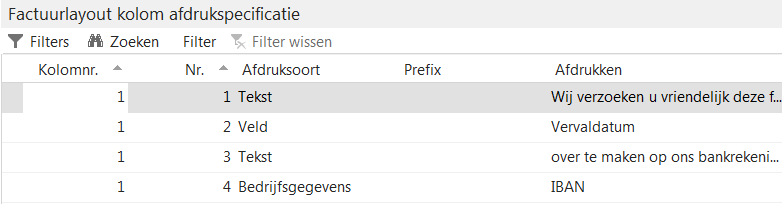 Let op: Vul het kolomnummer altijd in als u een factuurelement wilt opnemen, ook als u geen specifieke opmaak wilt definiëren. Laat u dit achterwege, dan kunt u in de sneltab Factuurlayout kolom afdrukspecificatie niet instellen wat er afgedrukt moet worden.