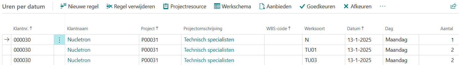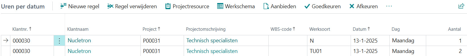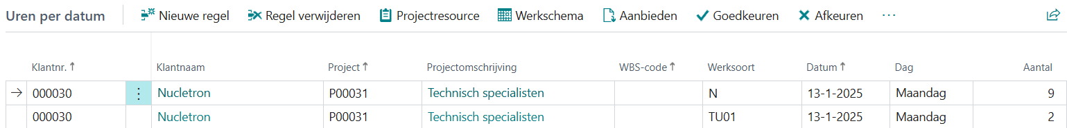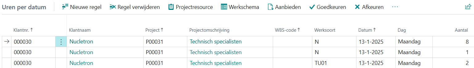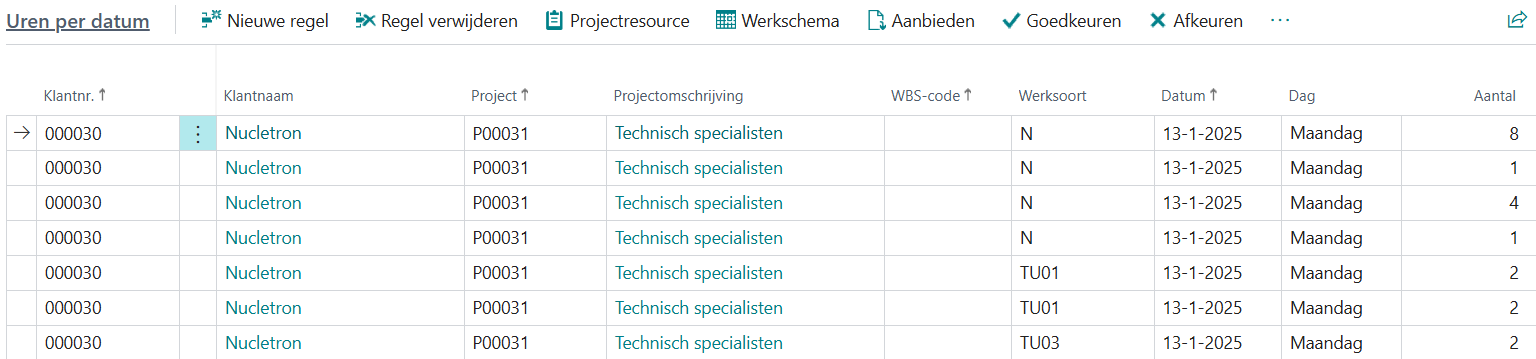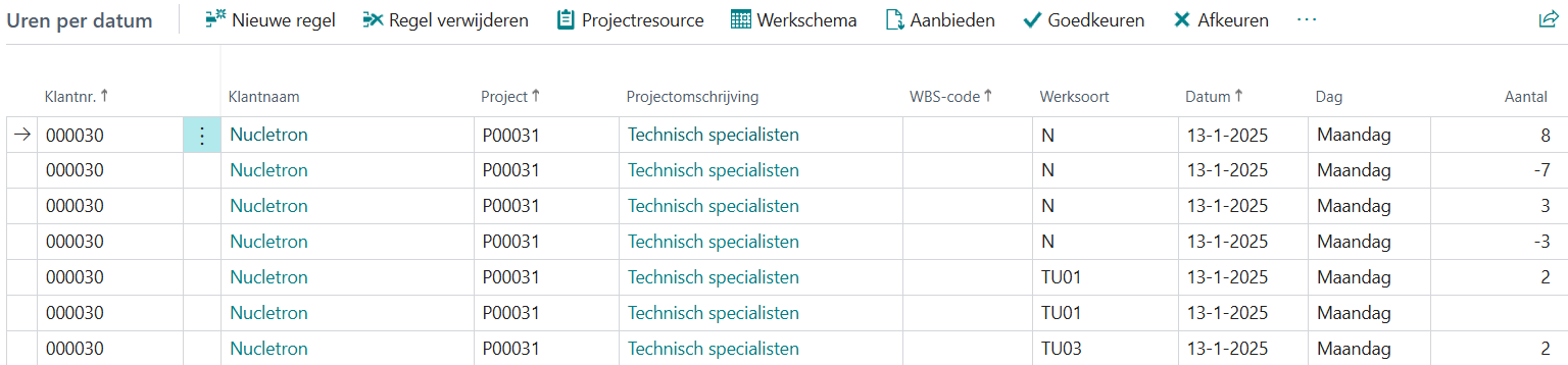 - Resultaat na eerste import: via deze methode is het wel mogelijk om meerdere urenregels voor dezelfde werksoort op dezelfde dag te importeren. De aantallen worden niet opgeteld maar als worden aparte urenregels aangemaakt.