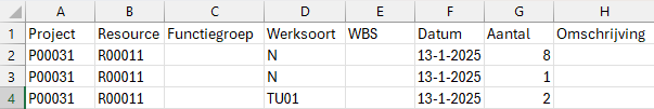 Vervolgens wordt (per methode) een tweede import gedaan met het volgende voorbeeldbestand. In dit bestand wijzigt 1 urenregel voor werksoort N, blijft de urenregel voor TU01 hetzelfde en komt er 1 urenregel bij voor werksoort TU03.