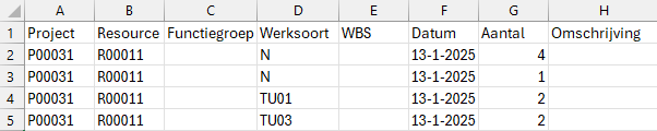 - Resultaat na eerste import: via deze methode is het al bij de eerste import niet mogelijk om meerdere urenregels voor dezelfde werksoort op dezelfde dag als aparte urenregels te importeren. Alleen de laatste urenregel (in dit geval 1 N-uur) wordt als werkelijkheid gezien.
