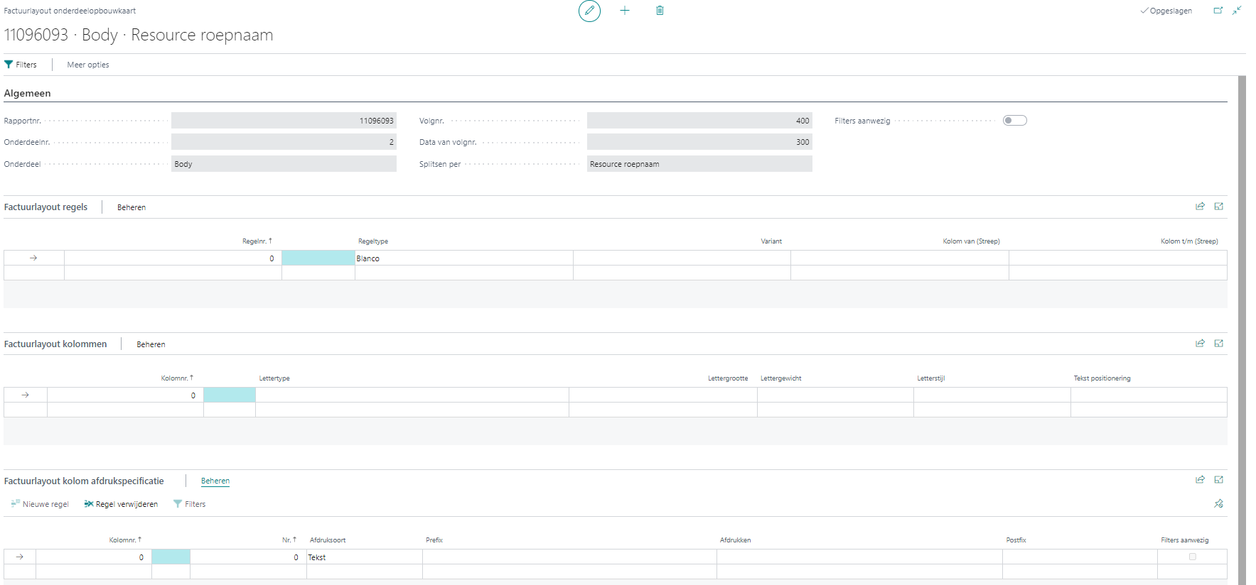 Let op: Vul het kolomnummer altijd in als u een factuurelement wilt opnemen, ook als u geen specifieke opmaak wilt definiëren. Laat u dit achterwege, dan kunt u in de sneltab Factuurlayout kolom afdrukspecificatie niet instellen wat er afgedrukt moet worden.