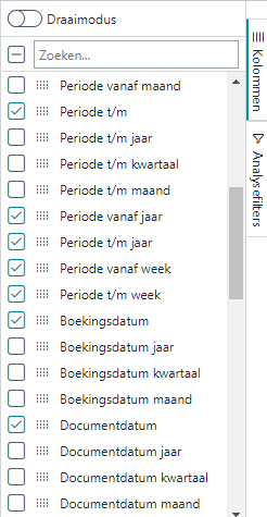 Als in de lijstweergave datumvelden zijn opgenomen, dan worden automatisch velden voor groeperingen toegevoegd in de vorm van een groep per jaar, kwartaal of maand. U kunt deze velden kiezen in de kolommen en in de filtering.
