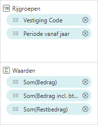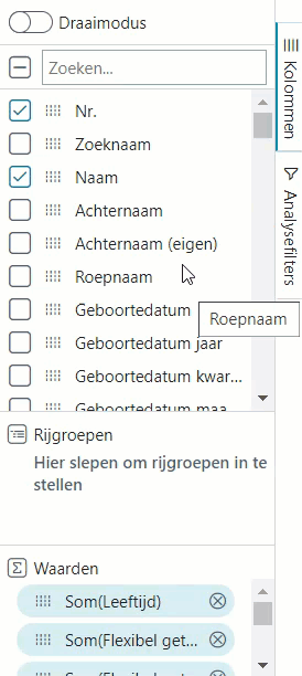 Een verdere verbijzondering is gebruik maken van optellingen van kolommen in de weergave. Sleep daartoe de kolommen die u wilt optellen naar het vak Waarden.