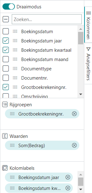 In deze modus kunt meer draaitabelachtige analyses maken. Het is dan niet meer mogelijk om de individuele records te openen. Dus een geboekte factuur zoals in het voorgaande voorbeeld is niet meer direct te openen.