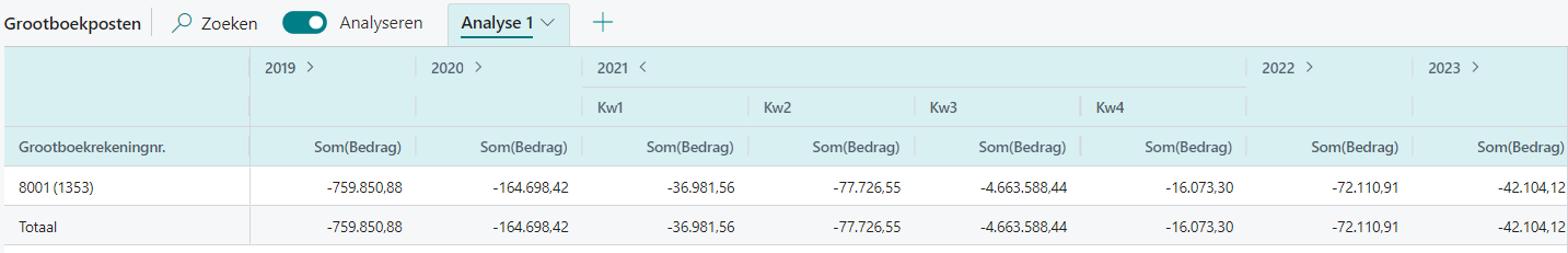 Een analyse in draaimodus van grootboekposten volgens de bovenstaande instellingen ziet er als onderstaand uit.