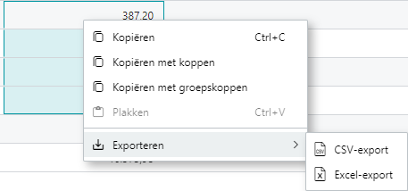 Het is mogelijk de gegevens uit de analyse te selecteren en te kopiëren of in zijn geheel te exporteren naar een CSV- of Excel-bestand.