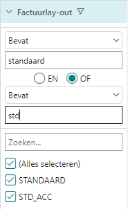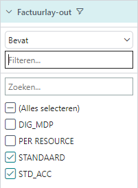 Voor velden die een lijst van keuze hebben ziet u welke geselecteerd zijn op basis van het filter. U kunt voor dit type velden ook de filtering leeglaten en de opties aanvinken die u wilt overhouden.