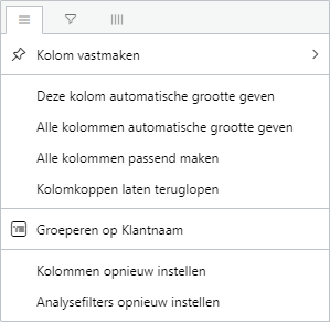 Door te klikken op de ‘hamburger’ naast de kolomtitel krijgt u opties om met kolombreedtes en groeperingen te werken.