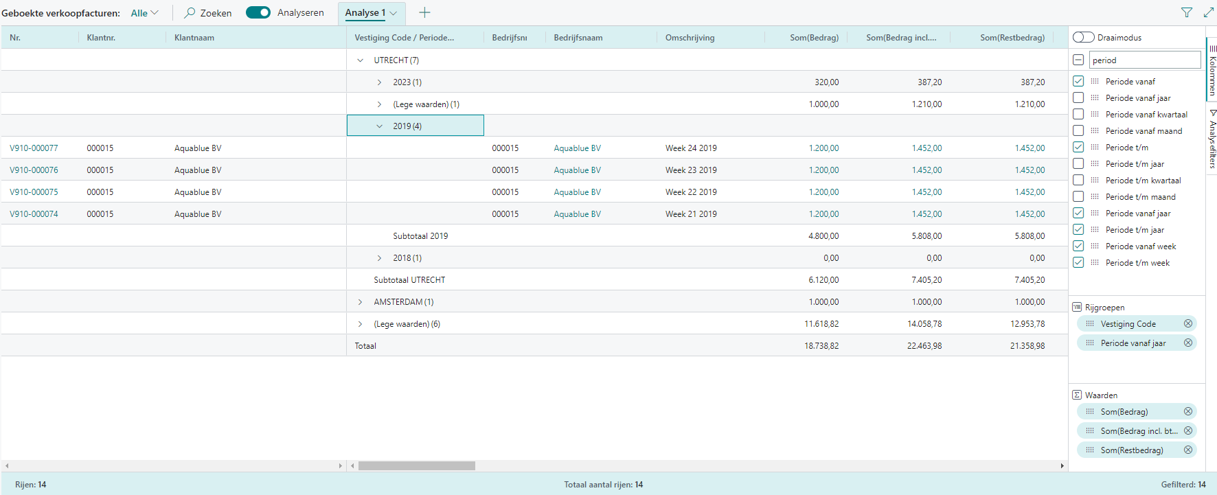 Het resultaat is een totaaloverzicht met groeperingen en totalen per rijgroep en totaal van de geselecteerde kolommen. Onderstaand voorbeeld toont geboekte verkoopfacturen gegroepeerd per vestiging en periode waarbij het bedrag, bedrag incl. btw en restbedrag per rijgroep en totaal zijn opgeteld.