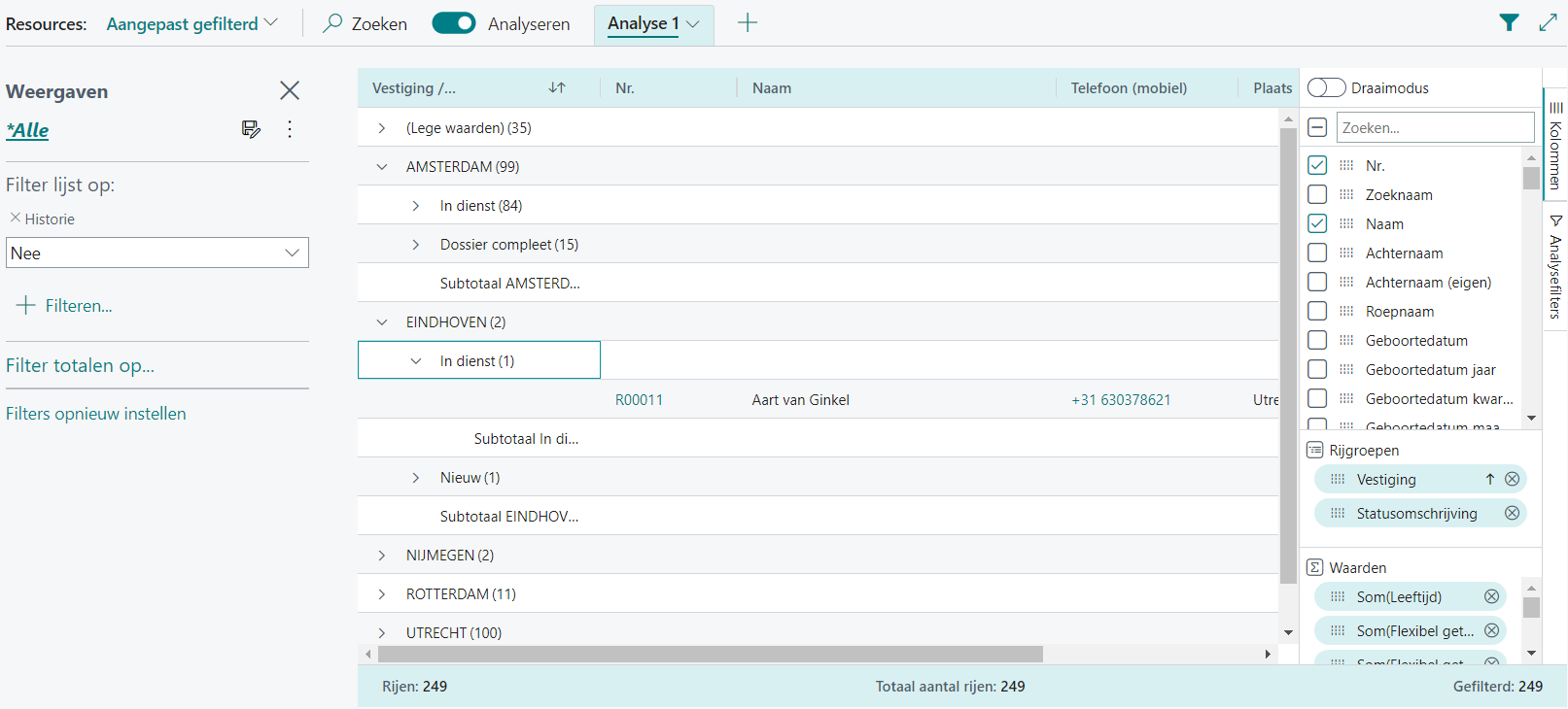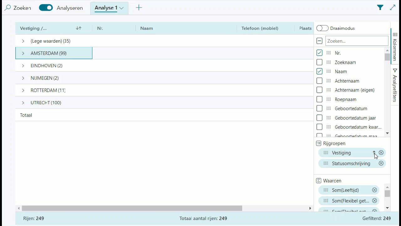 Met de analysemodus kunt u gegevens rechtstreeks vanaf de pagina analyseren, zonder dat u een rapport hoeft uit te voeren of naar een andere toepassing hoeft te schakelen zoals Excel. Het biedt een interactieve en veelzijdige manier om gegevens te berekenen, samen te vatten en te onderzoeken op een manier die lijkt op draaitabellen in Excel. Dit kan eenvoudig door de regels in een lijst van bijvoorbeeld resources op te tellen, maar ook meer geavanceerd door het totaal van openstaande klantenposten per vestiging op te tellen.