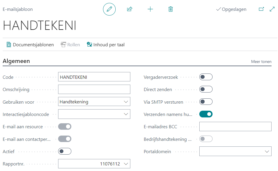 Maakt u een e-mail aan op basis van een e-mailsjabloon, dan wordt de e-mailhandtekening automatisch onderaan het bericht toegevoegd als in het e-mailsjabloon het veld Bedrijfshandtekening invoegen is ingeschakeld.