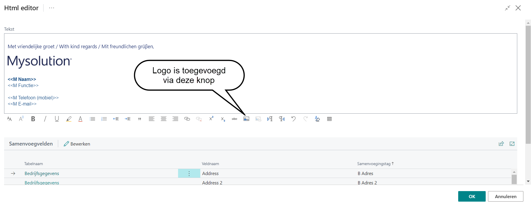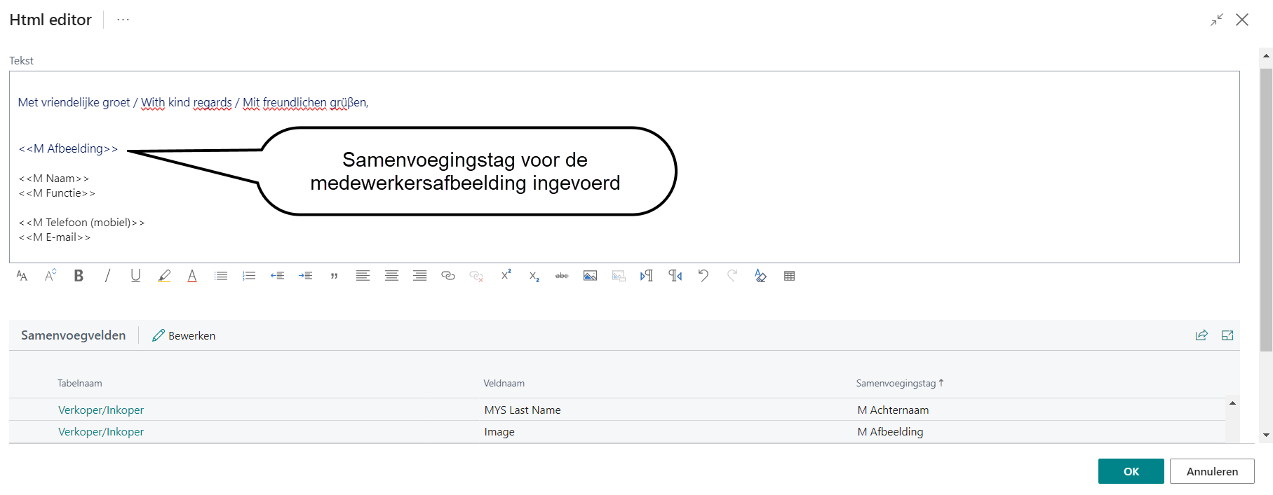 Het is mogelijk om de foto/afbeelding van de medewerker op te nemen in de e-mailhandtekening. Daartoe moet de pagina Samenvoegvelden een regel bevatten met tabelnr. 13 en veldnr. 140 (voor het veld Image).