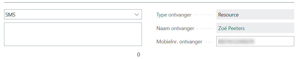 Rechts van het berichtvak is automatisch het mobiele telefoonnummer van de resource/het contact overgenomen, uit het veld Telefoon (mobiel). Wijzig het nummer indien nodig. Het mobiele nummer op de resource-/contactkaart wijzigt daardoor niet.