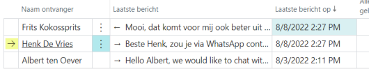 Als u de pagina Gesprek opent vanuit het onderdeel Mijn berichten in het rolcentrum, toont de gesprekslijst alle gesprekken die u hebt gevoerd met resources en/of contactpersonen. Dit biedt de mogelijkheid om van gesprek te wisselen door op een andere regel te klikken.