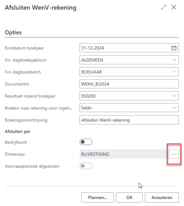 Eventueel kan het resultaat niet op totaalsaldo per rekening maar ook per dimensiewaarde worden tegengeboekt. Dit is nodig in geval van verplichte dimensies op kostenrekeningen. Dit leidt tot meer boekingen maar het saldo per grootboekrekening in combinatie met dimensies is dan op 1-1-2025 ook nul. Klik om aan te geven per welke dimensies de resultaatboeking moet worden gemaakt, achter Dimensies op