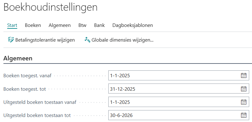 Het daadwerkelijk blokkeren van een boekjaar voor nieuwe boekingen wordt ingesteld op de pagina Boekhoudinstellingen. Door hierin bij Boeken toegest. vanaf de datum 1-1-2025 in te voeren is het niet meer mogelijk te boeken in 2024 en eerder. Ons advies is om ook het veld Boeken toegest. tot in te voeren om te voorkomen dat per abuis bijvoorbeeld 01-03-2052 wordt gebruikt.