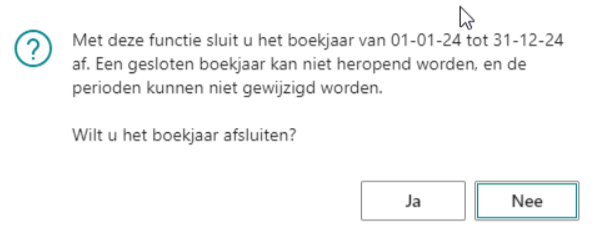 Om de perioden van het oude jaar af te sluiten, klikt u op de pagina Boekingsperioden op de knop Jaar afsluiten. U krijgt dan deze melding en vraag: