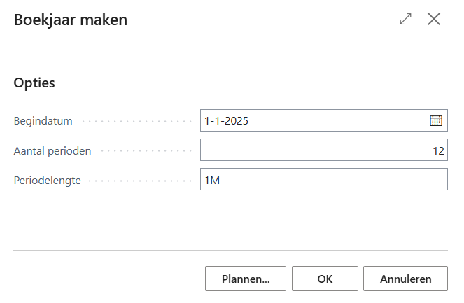 Voer in het veld Aantal perioden het aantal boekhoudperioden in waarin u het boekjaar wilt verdelen. Er kunnen maximaal 365 perioden in een jaar vallen.