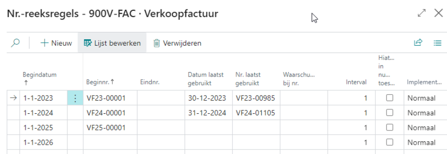 Voorbeeld: Nummerreeks voor facturen waarbij in de nummerreeksregels een extra regel met begindatum 1-1-2025 is aangemaakt:
