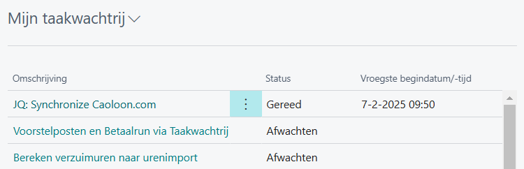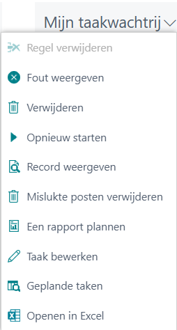 Als u op Mijn taakwachtrij klikt, zijn verschillende acties beschikbaar. U kunt onder andere de taakwachtrijpost opnieuw starten of de taakwachtrijpost bewerken. Als de taakwachtrijpost de status Fout heeft, vraagt u via Fout weergeven de foutmelding op.
