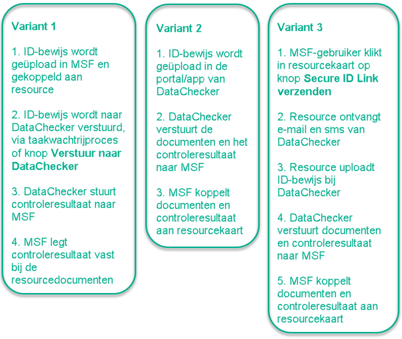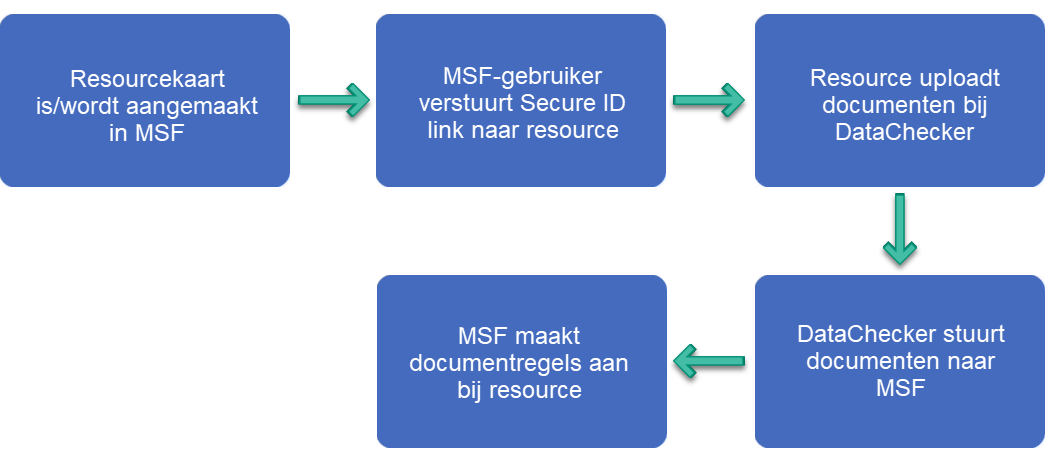 In beide gevallen stuurt DataChecker de bestanden die bij 1 controle horen (voor bijvoorbeeld de voor- en achterkant van het document) naar MSF. Voor elk pdf-document wordt een aparte documentregel bij de resource aangemaakt met het pdf-bestand en het resultaat van de controle. Zie ook Pagina Datachecker onderhoud.