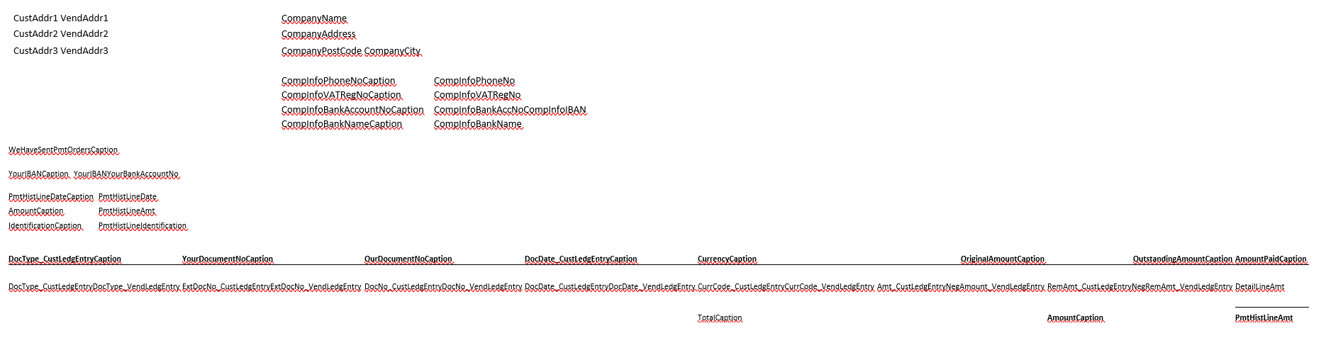 | CompInfoBankAccNo | Inhoud van het veld Bankrekeningnr. in de sneltab Betalingen van de pagina Bedrijfsgegevens |