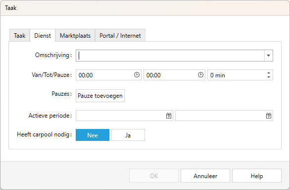 Let op: Bij het aanmaken van een nieuwe planningtaak wordt automatisch een dienst aangemaakt met de ingestelde start- en eindtijd. Om extra diensten toe te voegen aan een planningtaak zie Dienst toevoegen/bewerken.